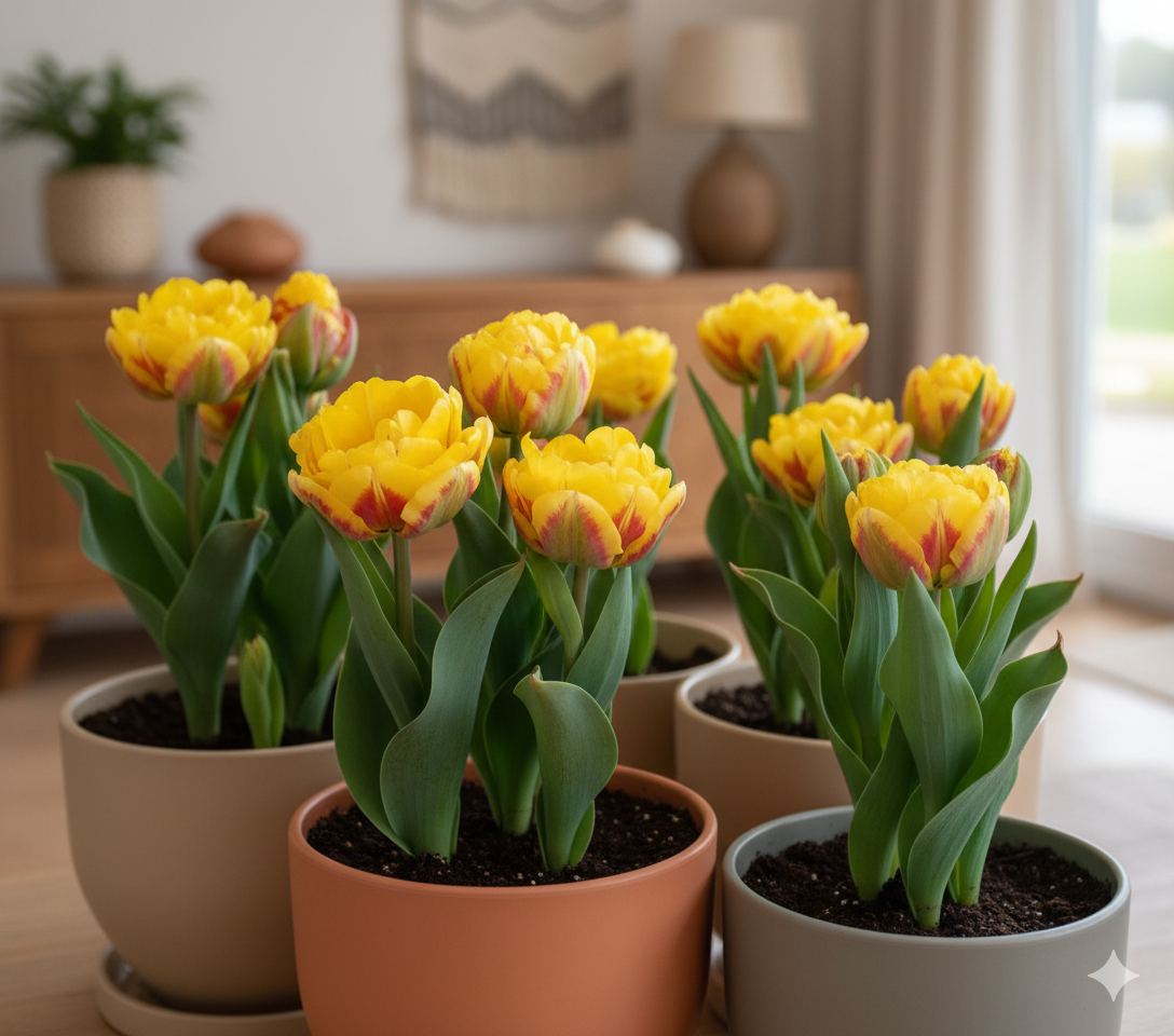 Для успішного вирощування тюльпанів «Ice Cream» у кімнатних умовах оберіть світле місце з м’яким, розсіяним освітленням.